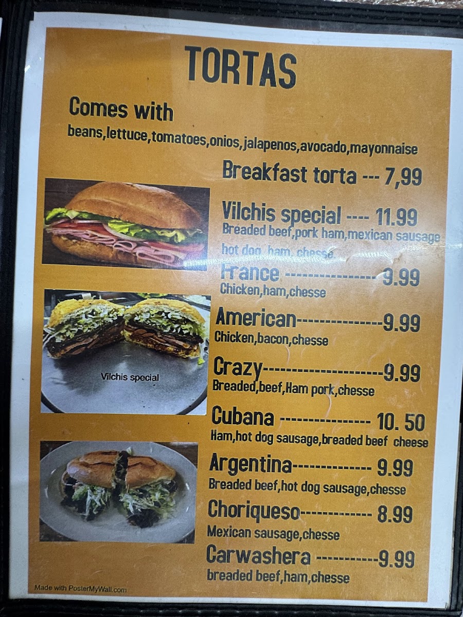 Each of these tortas is expertly crafted, showcasing the restaurant’s commitment to quality and flavor. While the prices for these tortas are not explicitly listed, they are known for being affordable and provide excellent value for the portion sizes and the richness of flavors served. Whether you are a first-time visitor or a regular, the Tortas at Taqueria Vilchis are a must-try, offering a satisfying meal that perfectly captures the essence of traditional Mexican comfort food.